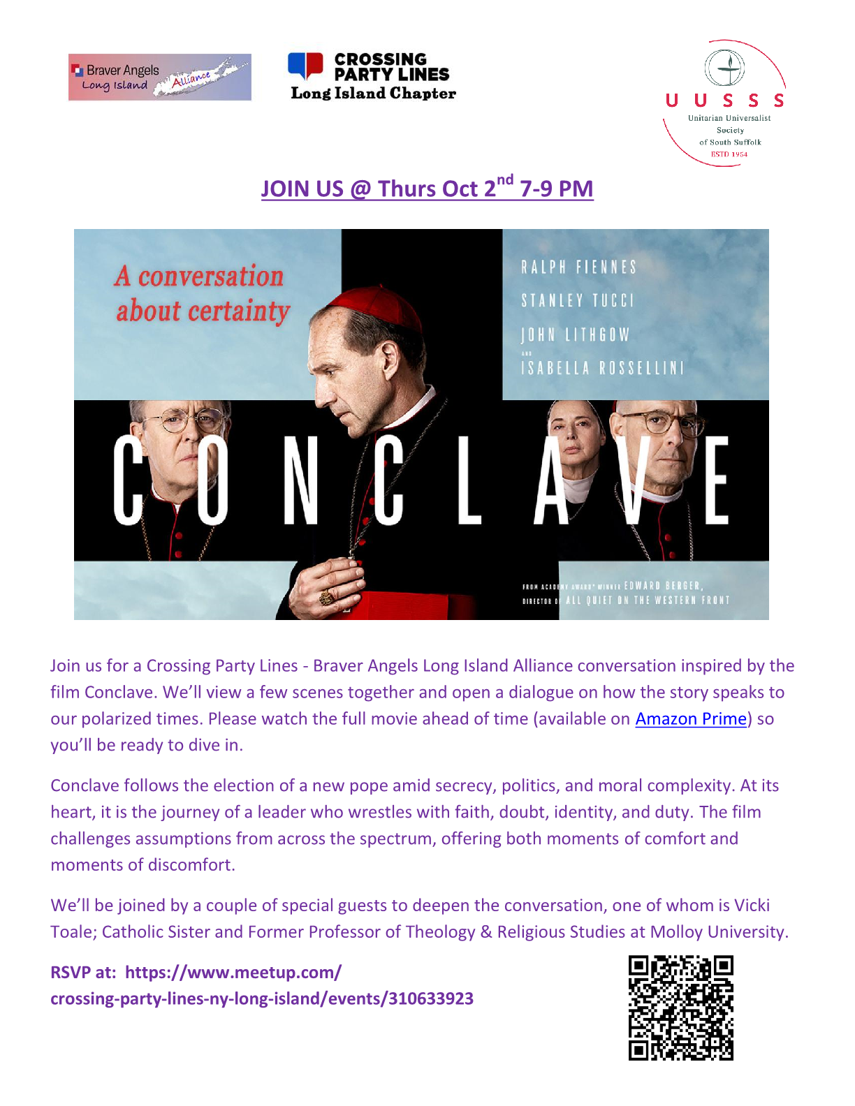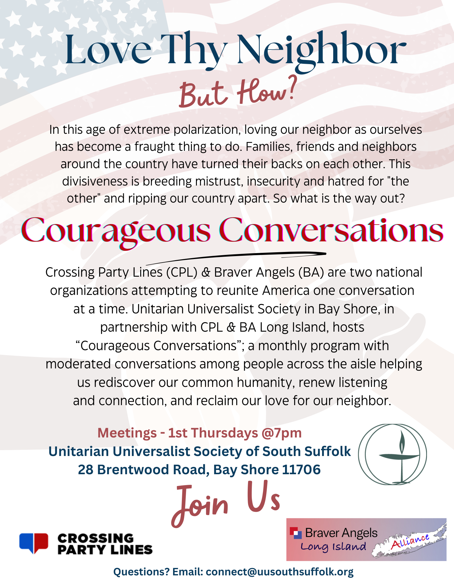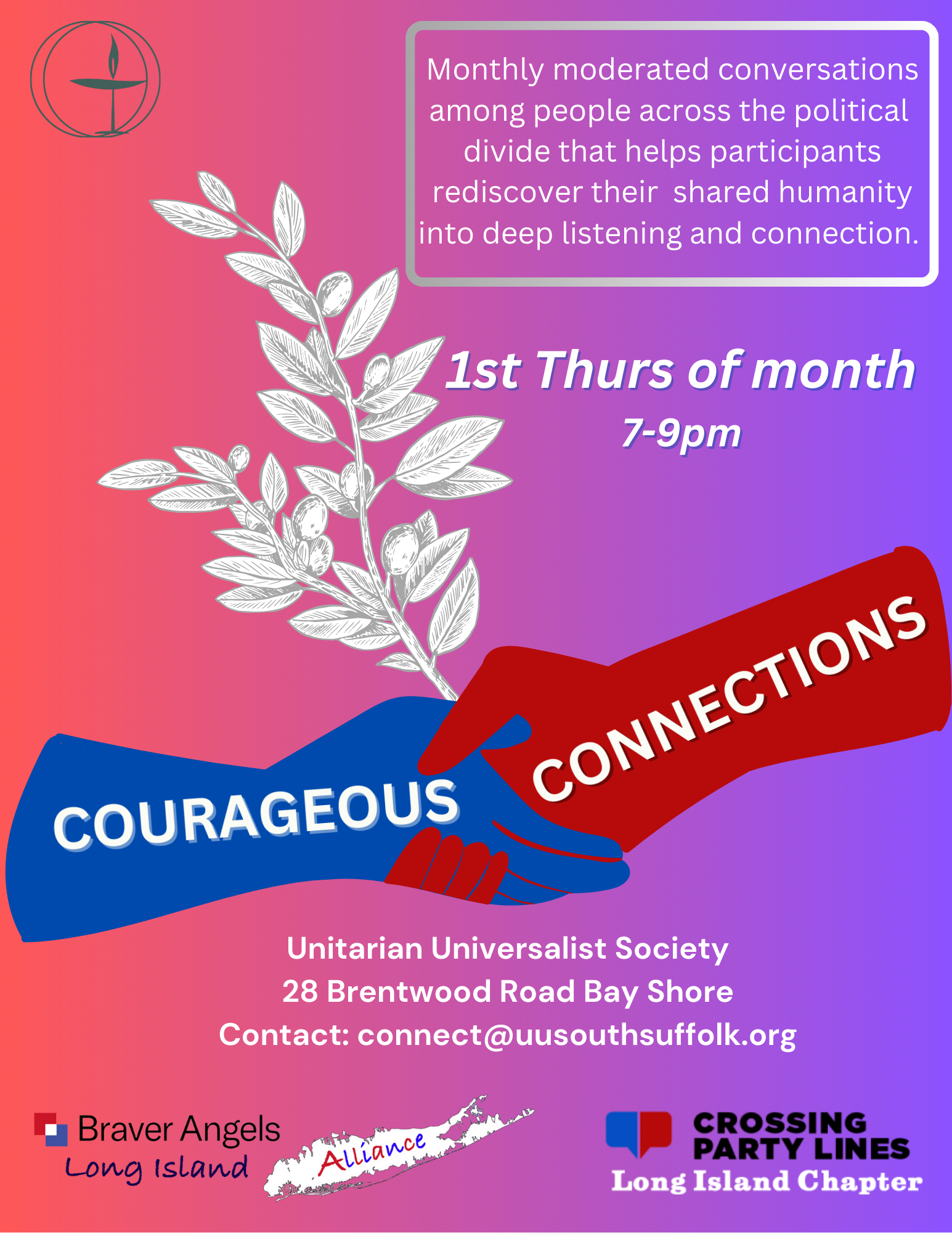 Unitarian Universalist Society in Bay Shore, in partnership with CPL & BA Long Island, hosts “Courageous Connections”; a monthly program with moderated conversations among people across the aisle helping us rediscover our common humanity, into renewed listening and connection, and reclaim our love for our neighbor.