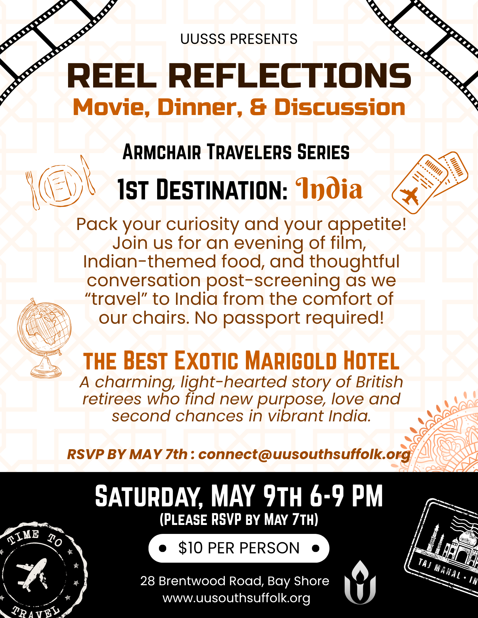 Reel Reflections (6-9pm) – February (off), May, August (off) November. An evening of movie, dinner & discussion. Our 2026 theme is “Armchair Traveler,” featuring films that take us around the world and invite reflection on culture, place, and human connection. May 9 kicks off the series with the Golden Globe Nominated film “The Best Exotic Marigold Hotel.” A warm, witty ensemble film about aging, friendship, and second chances, as a group of British retirees discover that life – and love – can begin again in the most unexpected places. See flyer on the left for more details.