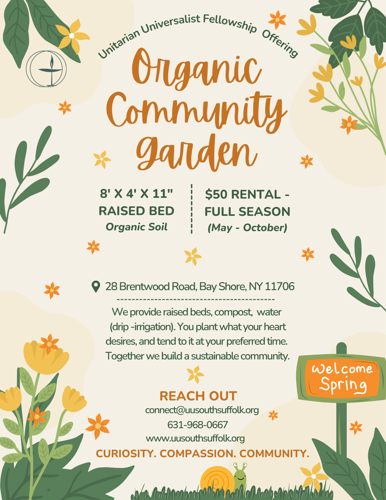 Climate Victory Gardens are inspired by the collective action Americans took during the WWI and WWII victory gardening movement. In Spring 2025, UU rear lawn was converted into an Organic Community Garden to grow food & walk the walk on Climate Justice. This garden has 8'x4' raised beds that the community is able to use thus it is also a Climate Victory Community Garden!